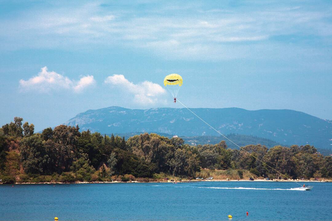 Kommeno Bay has some of the most coveted shoreline in all of Corfu – this is where Greece’s elite build their villas. Hotels own the beaches but non-guests can get to all of them. They’re scattered and very small, sometimes even just a patch of sand-and-shingle fit for 2. Watersports centres are based in the hotels – the parasailing gives you a really great view of Albania across the water.