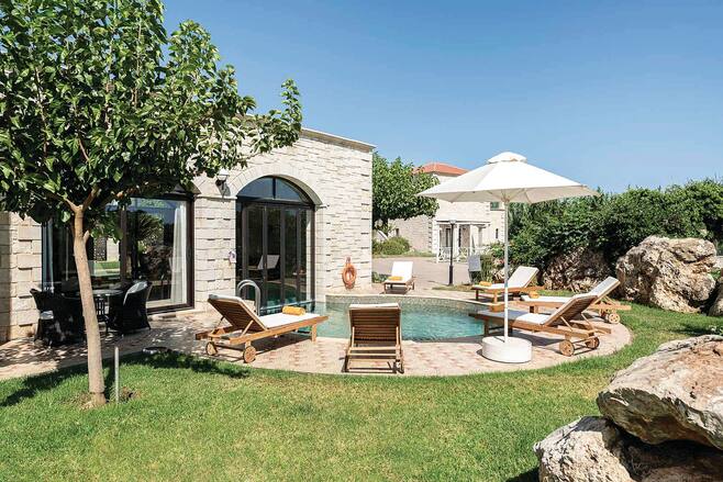 This cluster of villas is set in a tranquil area just outside Platanias. They look out over olive and orange groves, and are built in traditional Greek style, with stone walls, arches and terracotta roofs.Each property at Caldera Villas has its own landscaped garden and a sun terrace sprinkled with loungers and parasols. Inside, the focus is on pared-down elegance, especially in the pool area.