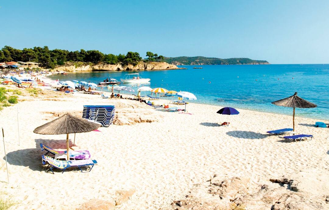 Potos Beach is a busy, 200-metre stretch of sand and shingle, gently lapped by clear shallow waters. There are lots of sunloungers and umbrellas, plus a couple of beach bars set back from the beach – there’s also a popular watersports centre for the more adventurous. Five minutes’ drive away is the quieter Psili Ammus Beach, with its quarter-kilometre stretch of fine white sand and clear, shallow waters. It has some more secluded spots – away from the bars and restaurants – on smooth rocks at the northern end of the beach.