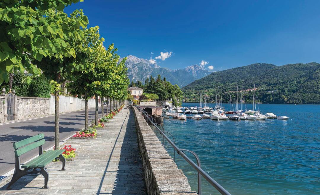 On the western shore of Lake Como, Tremezzo is surrounded by olive and orange groves and is set against an impressive mountain backdrop. The town is well-known for the palatial villas and stunning gardens strung along its classic lakefront promenade. When you want to explore further, hop on a ferry to Bellagio, Varenna or Isola Comacina to view its churches and ruins. Follow mountain walking trails for breathtaking vistas, find a pebble beach to relax on, and swim or windsurf in the sparkling waters.