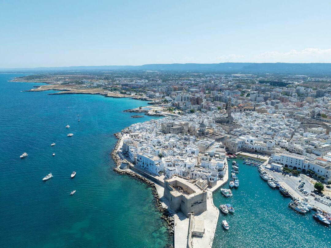 Monopoli is a picturesque port in the region of Puglia – an authentic corner of Italy that makes up the heel of its boot. Pinned to the Puglian coastline, Monopoli is known for its antique fishing harbour, where bright blue boats bob in front of the sun-bleached walls of the Centro Storico – Italy’s name for a historic old town. Inside, you’ll find a warren of white stone streets dotted with cafés, spritz bars, and artisanal boutiques. The whole thing is encircled by the Lungomare – a seafront promenade fortified by 16th -century castles and bastions.